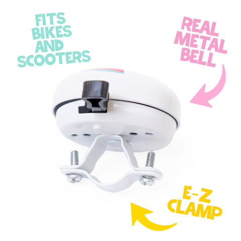 Each Bike Bell comes with our E-Z clamp for quick attachment to bikes, scooters, strollers, tricycles—you name it! All it takes is a screwdriver and a few moments later they're off to the races.